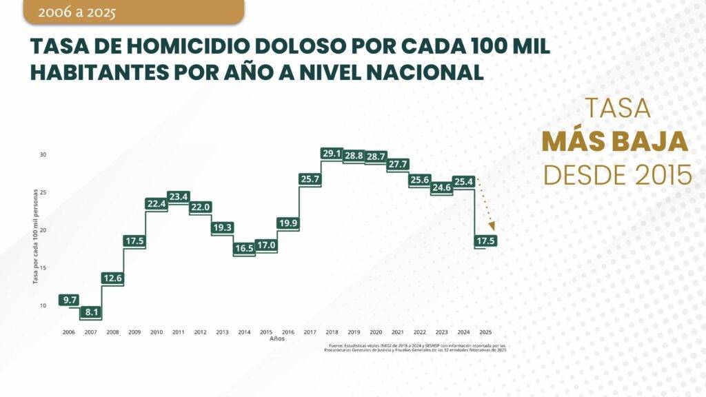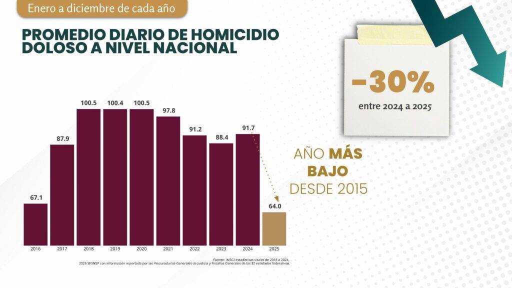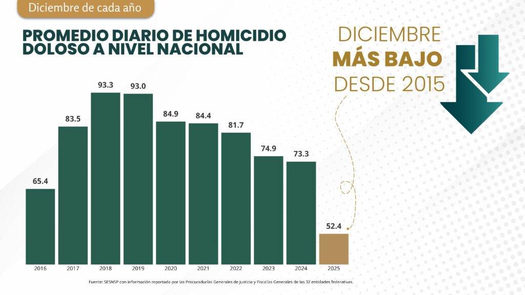 Al pasar de un promedio diario de 86.9 a 52.4 víctimas, lo que representa 34 homicidios diarios menos, ubicando a diciembre de 2025 como el más bajo desde 2015.