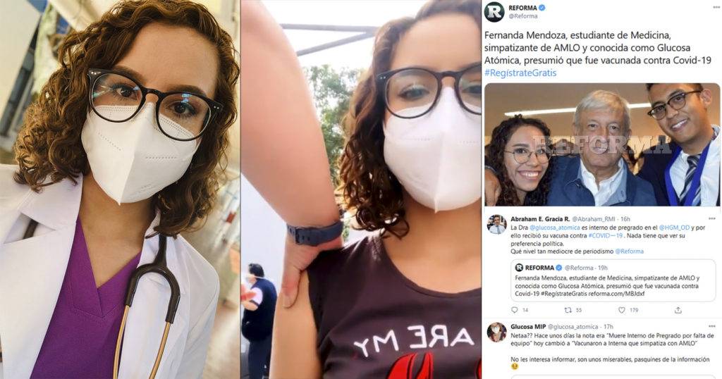 Sólo hasta los últimos párrafos el periódico Reforma menciona que es médica interna de pregrado; no sin antes destacar que lleva poco tiempo ejerciendo, como si hubiese un rango de antigüedad para poder inmunizarse y poder cuidar al resto de la población.
