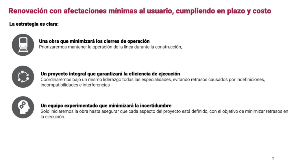 La renovación de la Línea 3 del Metro, tiene como prioridad afectar lo menos posible al usuario, mantenerse en operación durante la intervención y finalizar obras en el tiempo marcado.