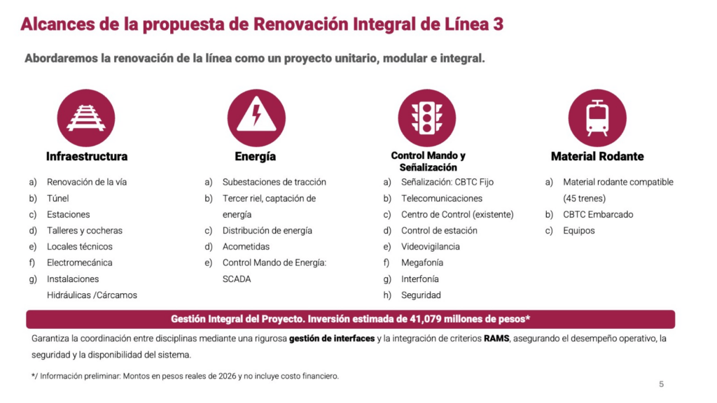 Los alcances abarcan infraestructura, renovación de túnel, estaciones, talleres y cocheras; cambio de instalaciones hidráulicas y de aire acondicionado; y mejorar la accesibilidad en las estaciones.