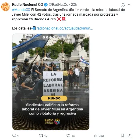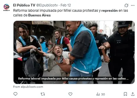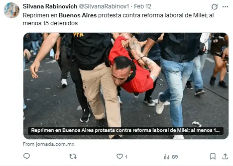 Regeneración, 13 de febrero 2026– La manifestación en contra de la reforma laboral promovida por Javier Milei, discutida este miércoles en el Senado, concluyó con un enfrentamiento descontrolado en Buenos Aires, donde se registraron disparos de balas de goma, chorros de agua y gases por parte de las fuerzas policiales.