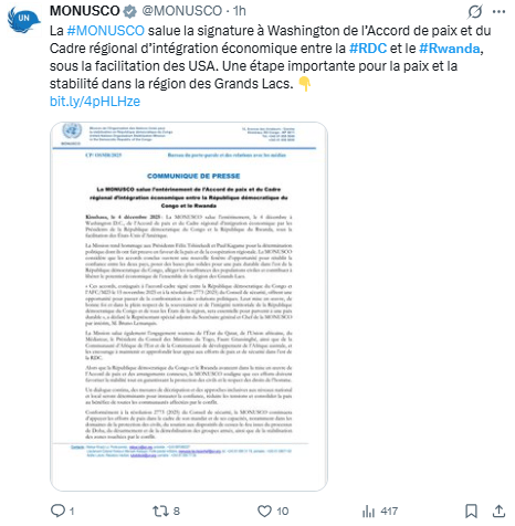 Sin embargo, la violencia continuó en la región, y en noviembre representantes de la RDC y del grupo rebelde firmaron en Doha otro documento.