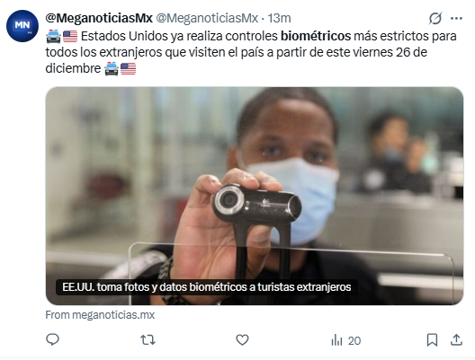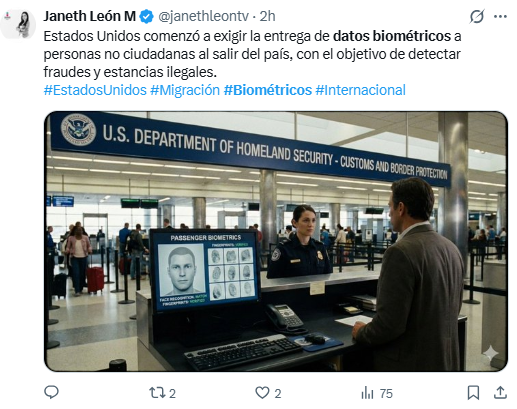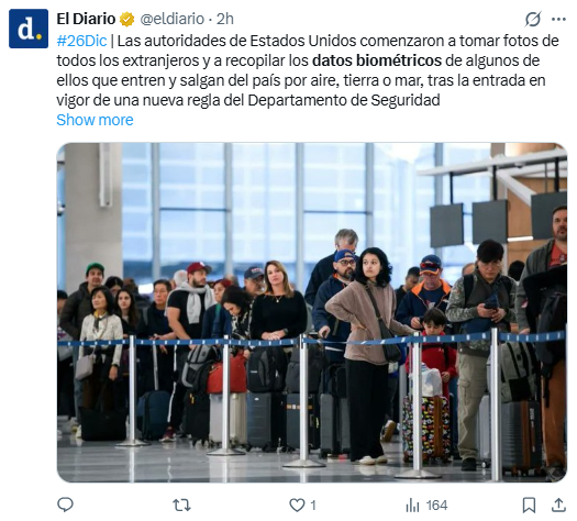 Regeneración, 26 de diciembre 2025– A partir de hoy, todos las personas sin ciudadanía en EE.UU., incluyendo titulares de visas y residentes legales permanentes, estarán sujetos a la recolección obligatoria de datos biométricos, principalmente fotografías faciales, al entrar y salir del país.