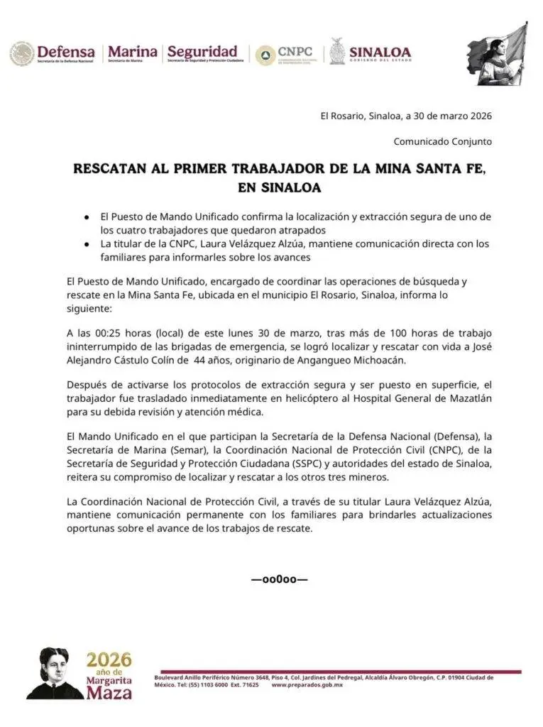 Regeneración, 30 de marzo de 2026.– Equipos de emergencia lograron rescatar con vida al primero de los cuatro mineros atrapados en la mina Santa Fe. El hallazgo ocurrió tras más de cien horas de labores ininterrumpidas en la sierra del municipio de El Rosario.
