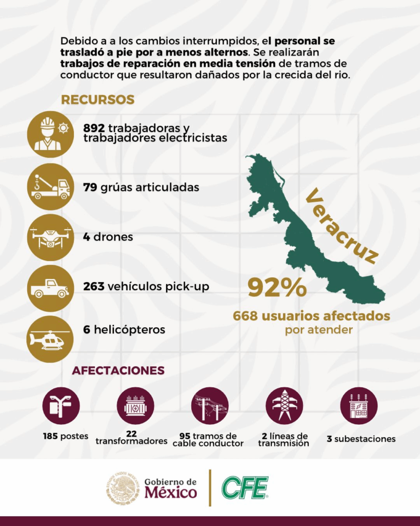 Con estos progresos, la CFE reafirmó su compromiso de recuperar al 100% el servicio eléctrico en los próximos días.
