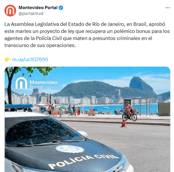 Regeneración, 26 de septiembre 2025– La Asamblea del estado de Río de Janeiro aprobó una ley que establece bonificaciones salariales para agentes de la policía civil en casos de confiscación de armas de gran calibre o en la neutralización de personas consideradas criminales.