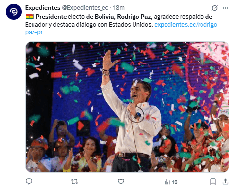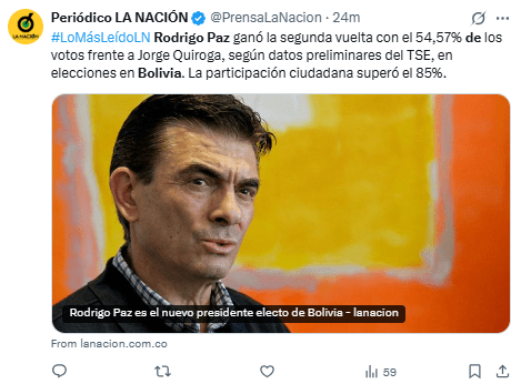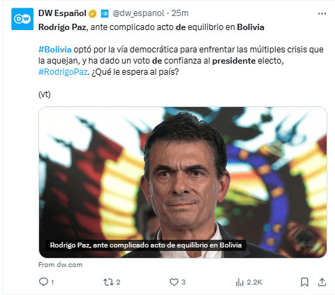 Regeneración, 20 de octubre de 2025– Rodrigo Paz, hijo del expresidente Jaime Paz, es electo en histórica elección que termina con 20 años de mandato del Movimiento al Socialismo (MAS), y pretende dar un giro a la derecha en la política boliviana.