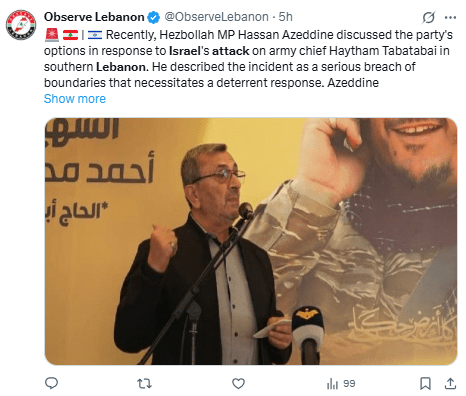 En una declaración publicada poco después del domingo, el ejército israelí dijo que «eliminó» al jefe del estado mayor de Hezbolá, Haytham Ali Tabatabai.