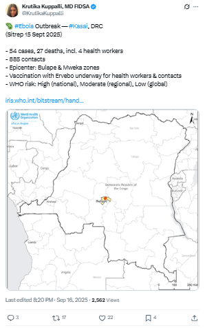 Regeneración, 18 de septiembre 2025– El director de la Organización Mundial de la Salud (OMS), Tedros Ghebreyesus, informó la muerte de 31 personas en República Democrática del Congo (RDC) por el brote de ébola.