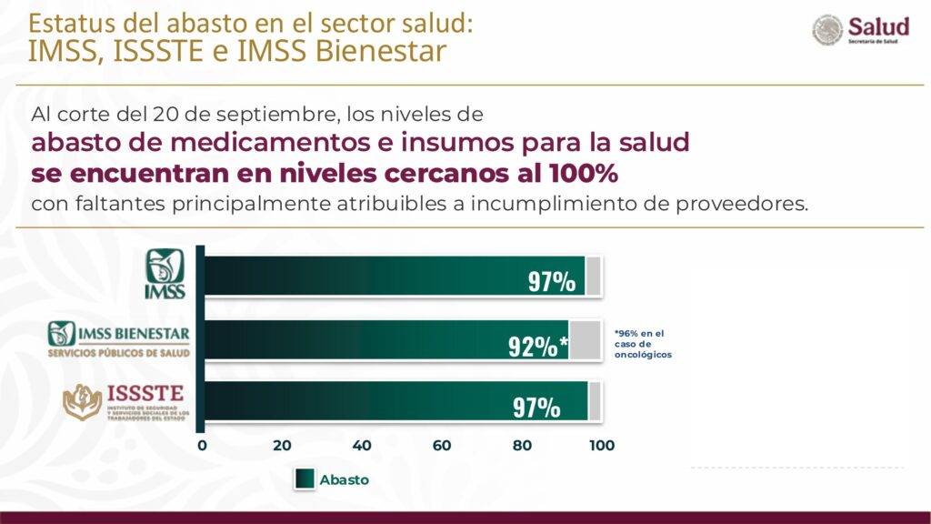 Además, dijo que en las tres grandes instituciones de salud el abasto es de 97 por ciento en el IMSS, 97 por ciento en el ISSSTE, y del 92 en el IMSS Bienestar.