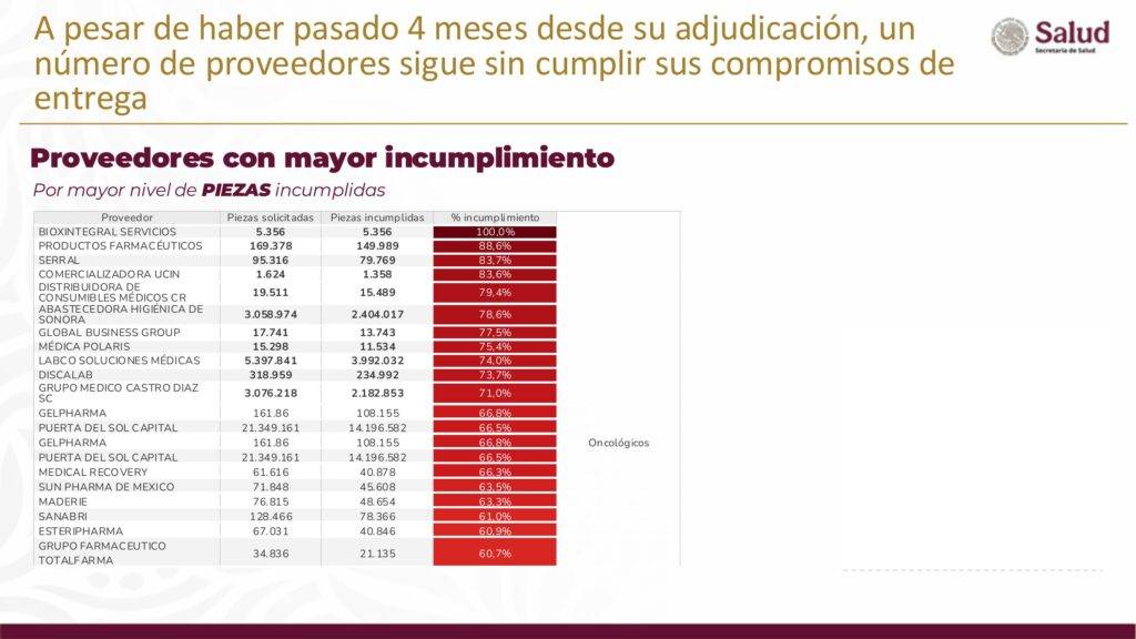 Además, indicó seis responsables del abasto en medicamentos oncológicos, con retrasos de entre 5.3 y 55 por ciento.