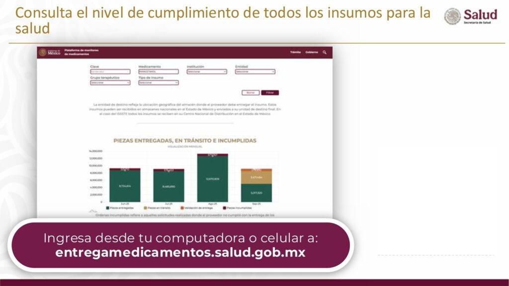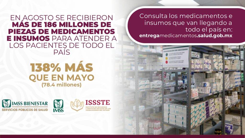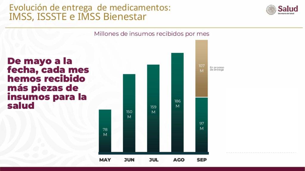 Así, en agosto se recibieron 186 millones de piezas de medicamentos, y se espera que al concluir septiembre se alcance un total de 204 millones de piezas entregadas en ese mes.