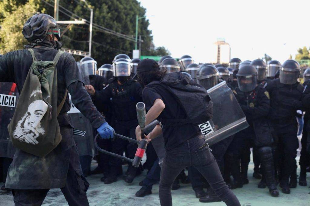 Sin embargo, un grupo de jóvenes con el rostro cubiertos y algunos otros vestidos de negro, que se identifican como “anarquistas”. Trataron de romper el cerco policiaco a la altura de Bellas Artes, por lo que se presentó un ligero enfrentamiento.
