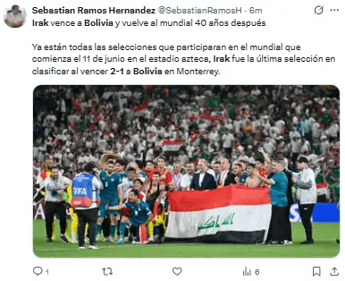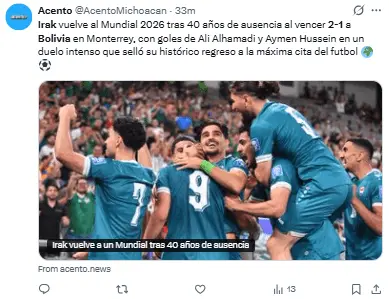 Regeneración, 1 de abril 2026– Irak se ha convertido en la selección de futbol número 48 en clasificar para el Mundial de la FIFA en Estados Unidos, México y Canadá, 2026, al derrotar a Bolivia en la final de un repechaje intercontinental.