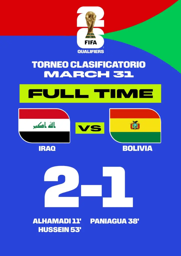 El equipo de Irak ganó a Bolivia por 2-1 y se unirá al Grupo I en la Copa del Mundo de Estados Unidos, México y Canadá