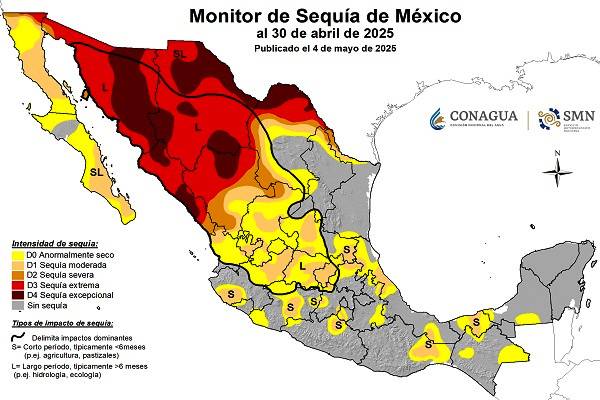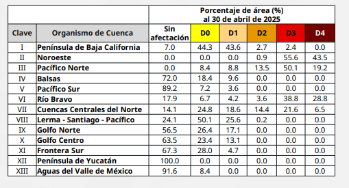 Al 30 de abril de 2025, el porcentaje de áreas con sequía de moderada a excepcional (D1 a D4) a nivel nacional fue de 46.5%, ligeramente mayor (0.7%) a lo registrado el 15 de abril del mismo año.
