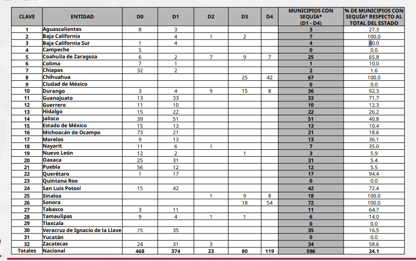 A esta fecha existen 509 municipios con sequía en México, asimismo 468 municipios se contabilizan como anormalmente seco.