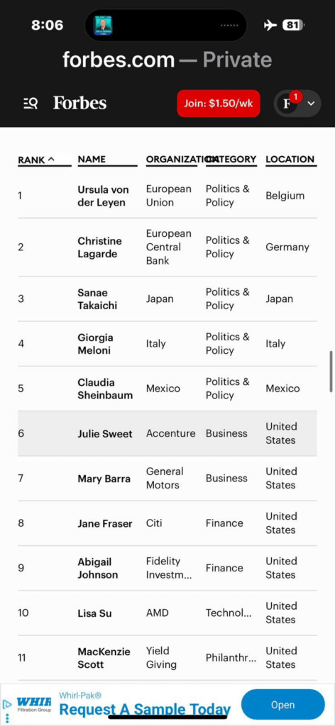 Y es que dicho listado reconoce a las 100 mujeres con mayor impacto global en política, negocios, tecnología y finanzas en 2025.