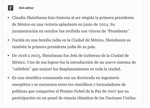 Forbes describe a Claudia Sheinbaum como la mujer que «hizo historia al ser elegida la primera presidenta de México con una victoria aplastante en junio de 2024.