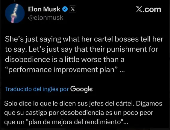 Al decir que su castigo sería «peor que un PIP», Musk implica que: Si ella no cumple con las órdenes de sus supuestos «jefes» (los cárteles), la consecuencia no sería un simple despido laboral, sino algo violento o mortal.