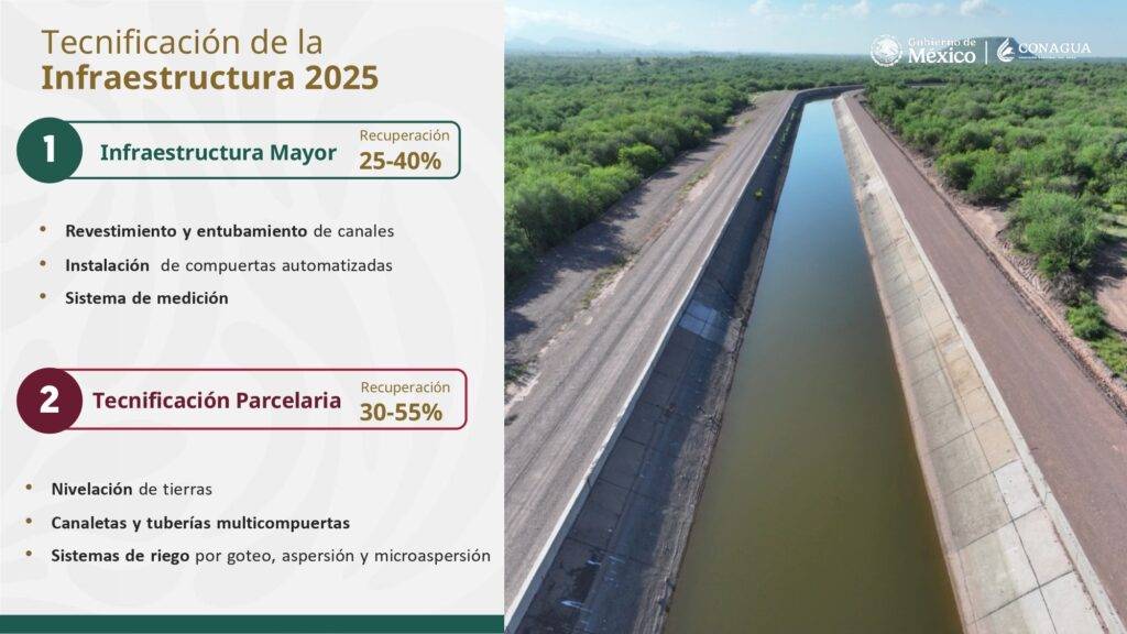Uno. Es la tecnificación de la infraestructura mayor. ¿Qué es eso? Es toda la infraestructura de conducción del agua que viene de las presas y que va a hasta la parcela.