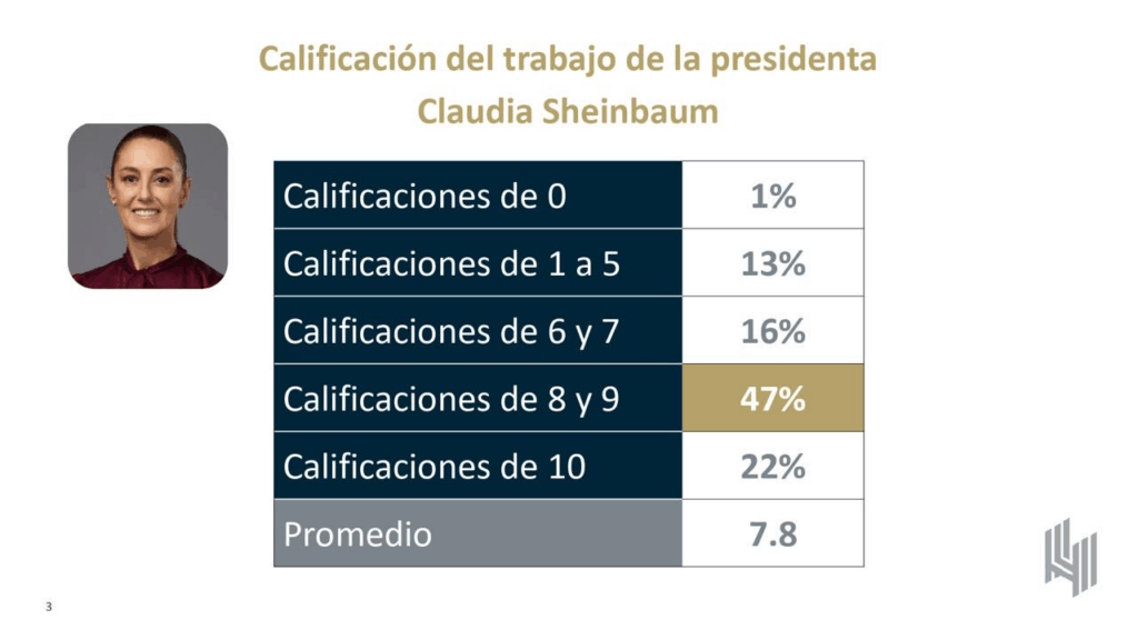 Evaluación de Gestión: Solo 15% desaprueba a Sheinbaum, 8% ni si, ni no y 3% no sabe. 22% otorga 10 de calificación y 47% califica entre 8 y 9