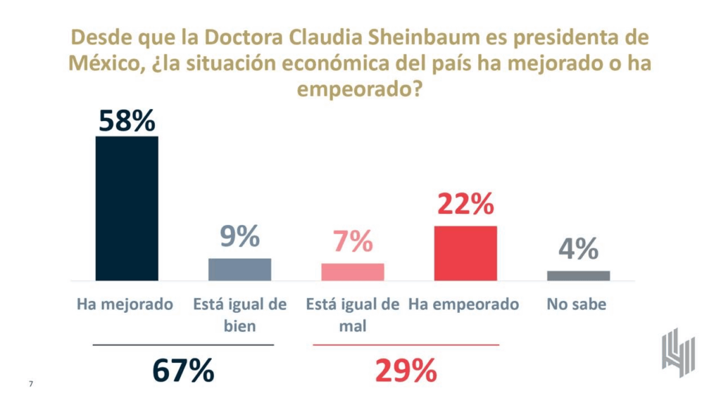 Cabe destacar que el 58% consideró que la situación económica del país ha mejorado con el gobierno de Sheinbaum a lo que se suma un 9% que dijo que «está igual de bien».