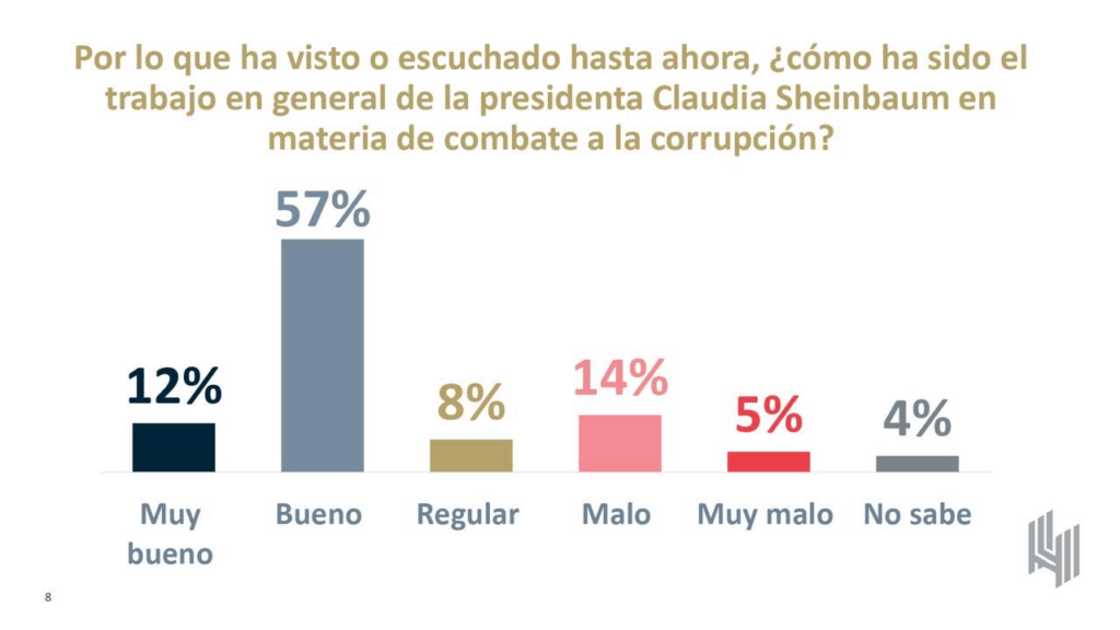 Cabe destacar que con relación a la corrupción el trabajo de la primera presidenta de México recibe una aprobación de 12% muy bueno, 57% bueno, esto es 69% positivos.
