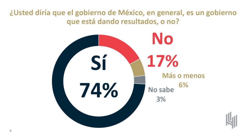 Y las respuestas que indican un amplio 74% que considera que tenemos un gobierno con resultados, más o menos dice 6%, 17% considera que no hay resultados y 3% no supo.