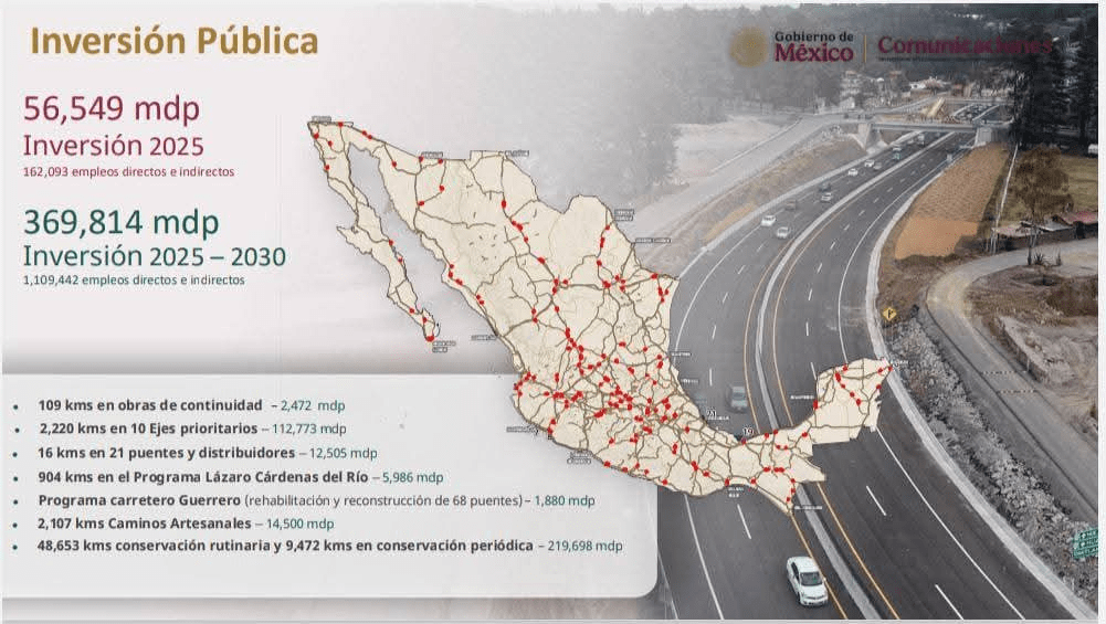 De 2025 a 2030 se invertirá 369 mil 814 millones de pesos para construcción y modernización de carreteras que crearán más de un millón de empleos: Sheinbaum