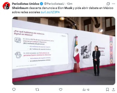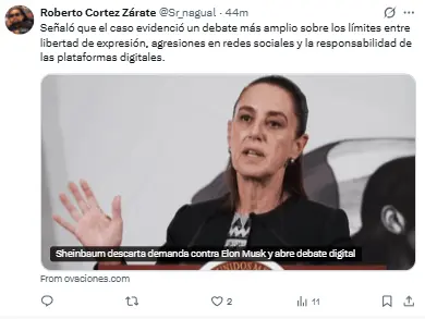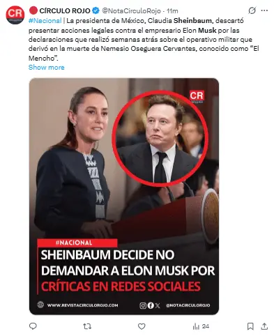 Regeneración, 11 de marzo 2026– La Presidenta Claudia Sheinbaum Pardo finalmente optó por no presentar un pleito civil contra Elon Musk, el empresario y líder de X, quien la acusó de tener presuntos lazos directos con el crimen organizado.