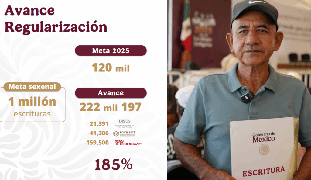 Agregó que, también, ya se han regularizado 222 mil 197 escrituras, respecto a la meta sexenal de un millón.