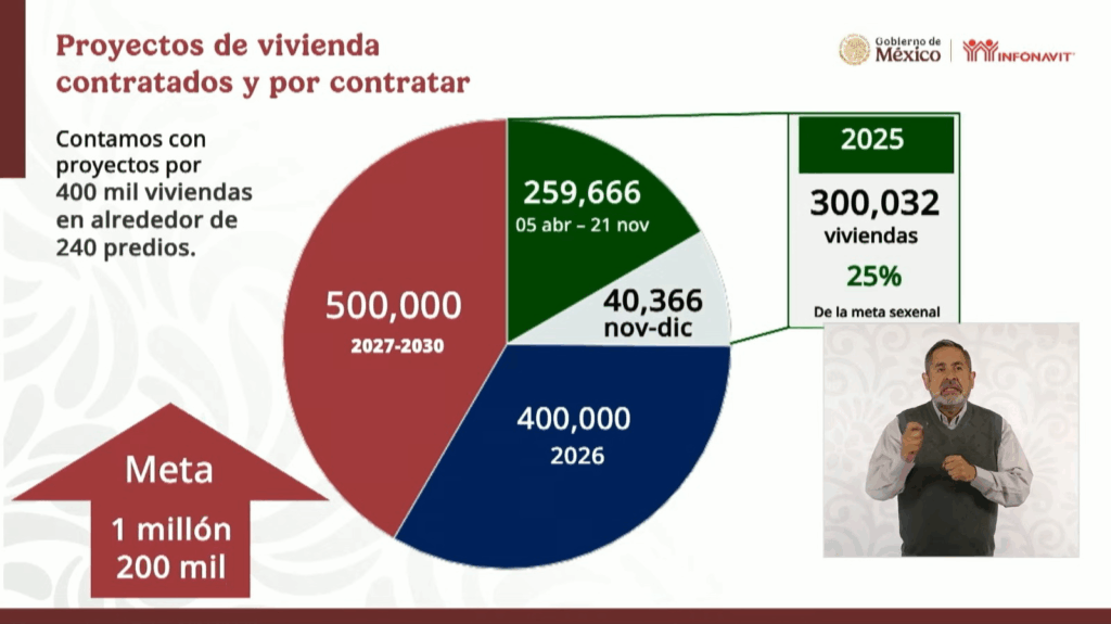 Sobre la construcción de vivienda, destacó que al cierre de este año se tendrán proyectos contratados para 300 mil 32 viviendas, el siguiente año serán 400 mil.