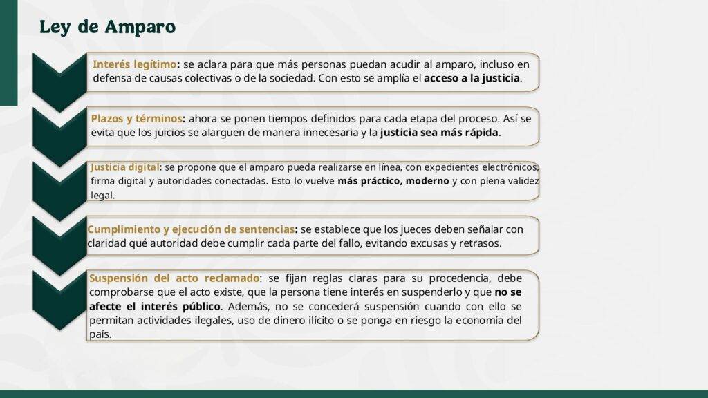 Que tienen el objetivo de fortalecer el juicio de amparo, subrayó además. Esto, para que sea más ágil y que garantice el acceso a la justicia, estableciendo plazos y términos claros.