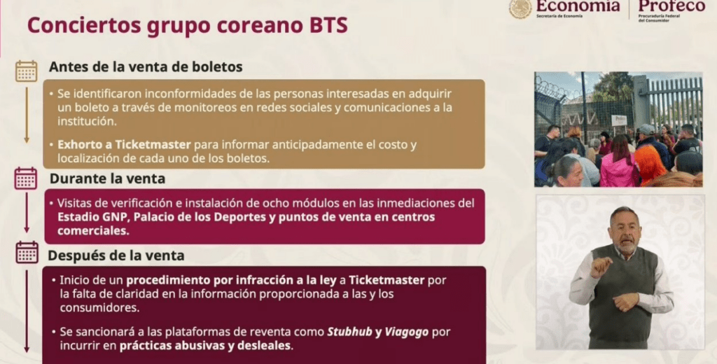 Por su parte, el titular de Procuraduría Federal del Consumir (Profeco) informó que iniciará un proceso de sanción contra Ticketmaster y plataformas de reventa por no publicar información clara del evento.