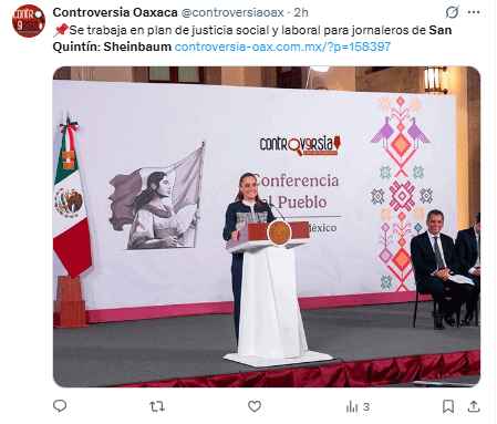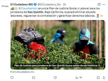 A través de sus redes sociales, indicó que el estado apoyará el plan de justicia para los jornaleros agrícolas de San Quintín.