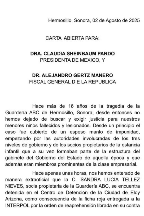Cabe destacar que se trata de una carta dirigida a la presidenta de México, Claudia Sheinbaum, y al fiscal general de la República, Alejandro Gertz Manero.