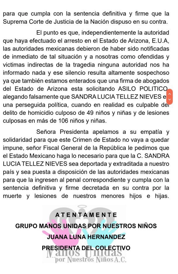 Misma, socia de la estancia infantil, y exigieron su extradición inmediata a México.