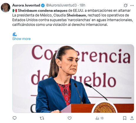 Más tarde ese día el presidente estadounidense Donald Trump apuntó a México en su campaña antidrogas, insinuando que Sheinbaum no tiene el control de su país.