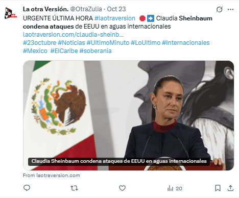 Regeneración, 24 de octubre 2025– La presidenta de México, Claudia Sheinbaum, se ha pronunciado contra la reciente serie de ataques aéreos que Estados Unidos ha llevado a cabo en el Mar Caribe y, más recientemente, en el Océano Pacífico.