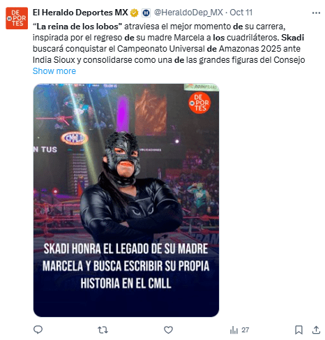 Regeneración, 14 de octubre 2025– Skadi, La Reina de los Lobos, es una luchadora reconocida del Consejo Mundial de Lucha Libre. Para llegar aquí ha batallado, no solo arriba del ring, con constantes señalamiento hacia su físico.