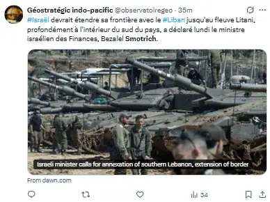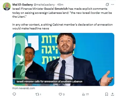 El ministro de finanzas de extrema derecha de Israel sostiene que el río Litani debería ser «la nueva frontera israelí»
