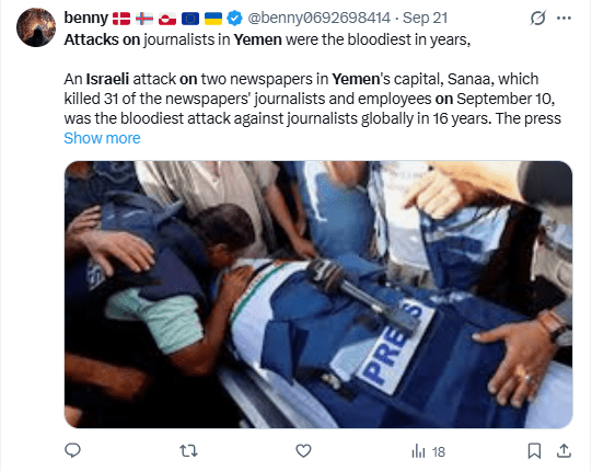 Regeneración, 22 de septiembre 2025– Treinta y un periodistas murieron en ataques israelíes en Yemen, en lo que el Comité para la Protección de los Periodistas (CPJ) calificó el viernes como el ataque más mortífero contra periodistas en los últimos 16 años.
