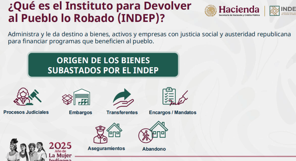 Regeneración 24 de julio de 2025. La presidenta Sheinbaum anunció que del 25 de julio al 6 de agosto se realizará la primera subasta en línea del Instituto para Devolver al Pueblo lo Robado (INDEP) de este año.