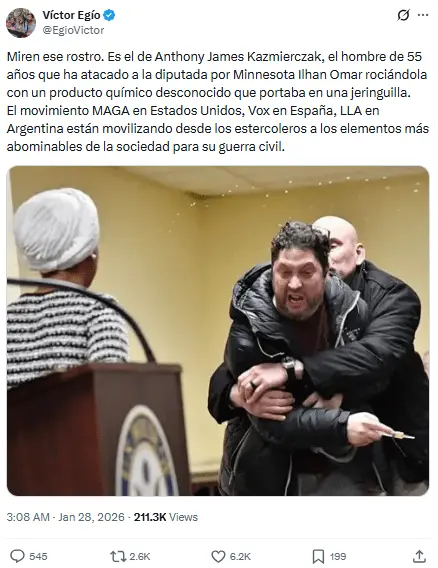 Regeneración, 28 de enero 2026– Un individuo roció una sustancia sobre la congresista demócrata Ilhan Omar y fue derribado, en un ayuntamiento en Minneapolis, donde las tensiones por ICE han aumentado considerablemente, tras el asesinato de un enfermero y de una madre con tres hijos este mes a manos de agentes federales.