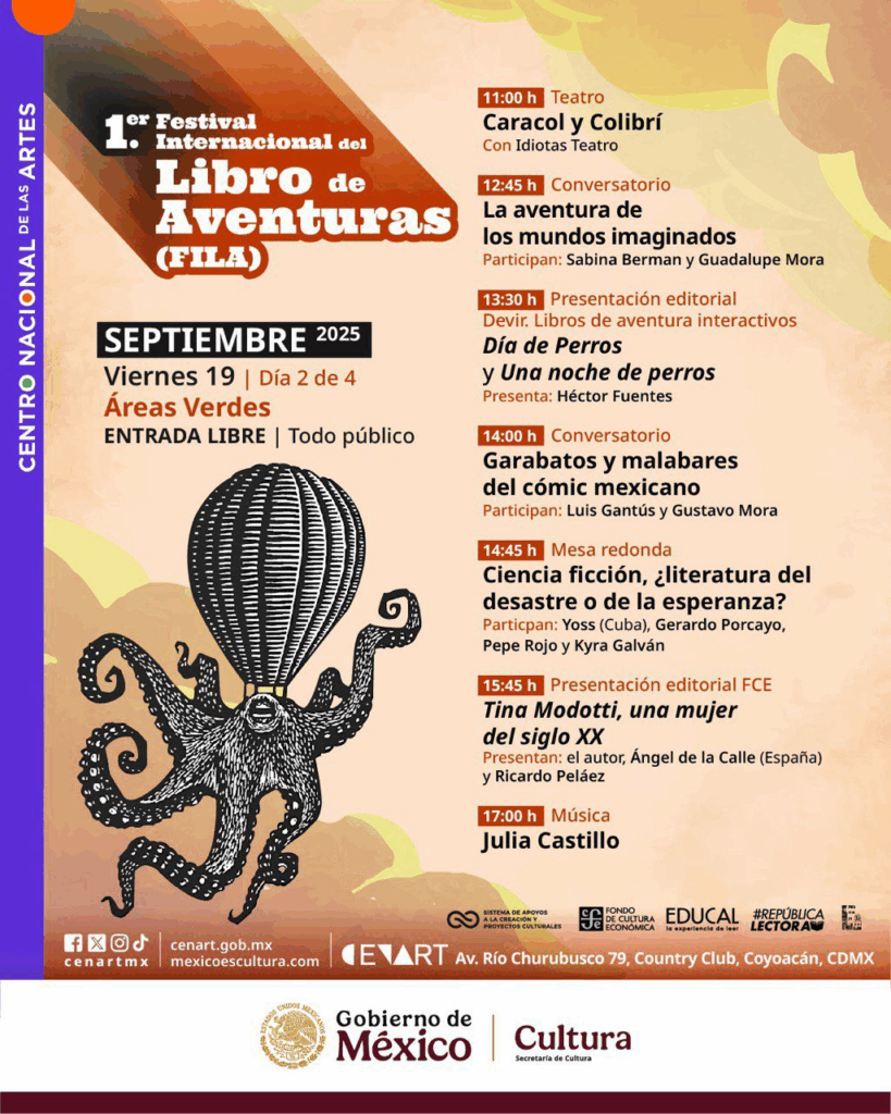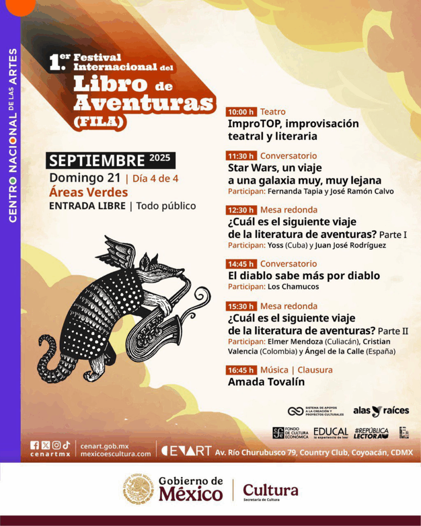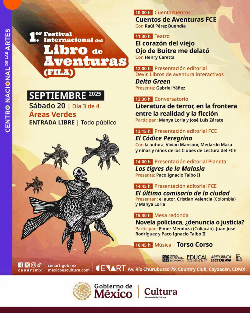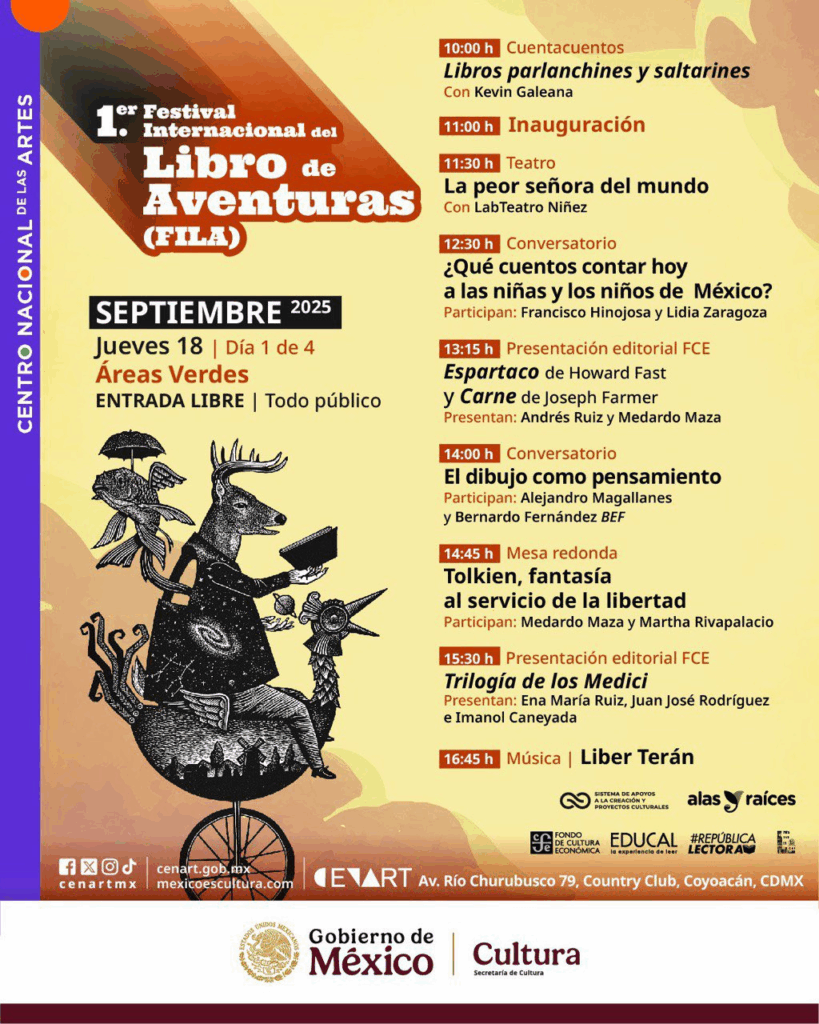 Regeneración, 15 de septiembre de 2025. El Centro Nacional de las Artes (Cenart) será la sede de la primera edición del Festival Internacional del Libro de Aventuras (FILA).