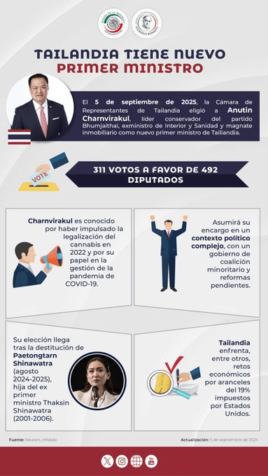 Regeneración, 5 de septiembre 2025– El parlamento de Tailandia ha elegido a Anutin Charnvirakul, líder del partido conservador de oposición Bhumjaithai, como primer ministro del país.