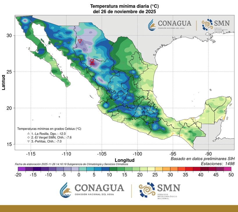 Regeneración, 26 de noviembre 2025– La primera tormenta invernal de la temporada 2025-2026 ya comenzó en el país, aunque el Servicio Meteorológico Nacional (SMN) informa que pronto dejará de afectar, aunque algunas regiones se verán congeladas ante las bajas temperaturas que se esperan.
