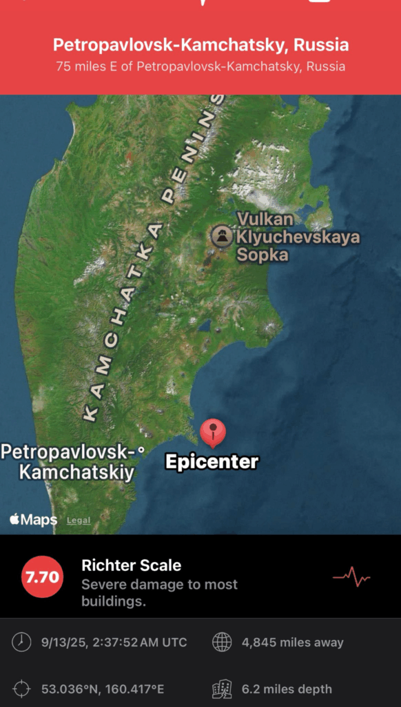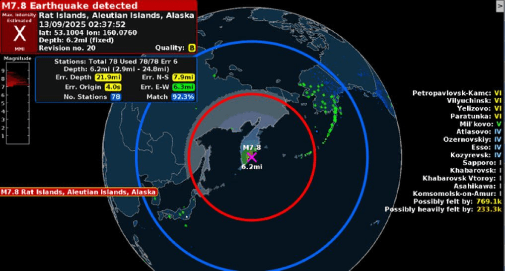 Regeneración, 18 de septiembre 2025– Un terremoto de magnitud 7,8 se registró el viernes cerca de la península rusa de Kamchatka, a 128 km al este de Petropávlovsk-Kamchatski, a una profundidad de 10 km.