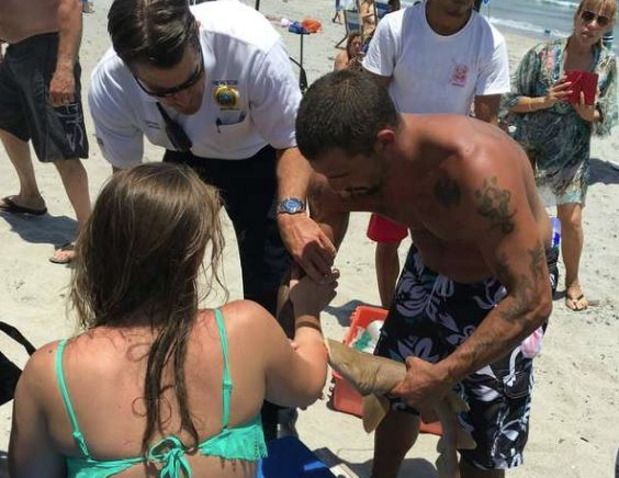 Otro testigo llamado Clint Tracy dijo a un periódico local que el brazo de la chica fue inmovilizado con una férula y pusieron a ambos (el tiburón y la mujer) en una camilla para llevarla al hospital.
